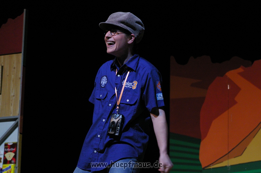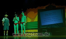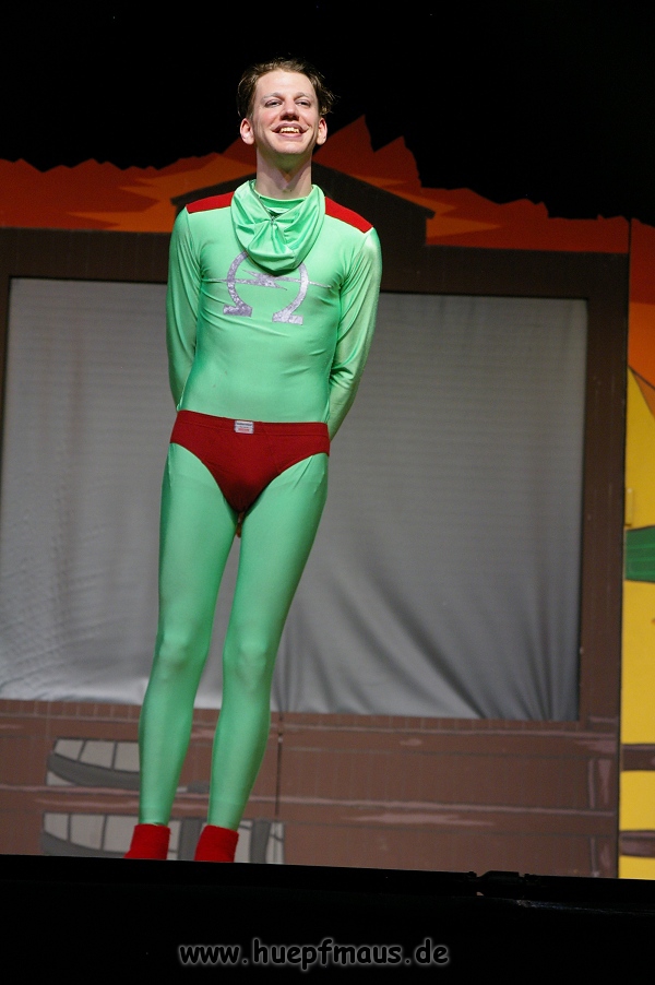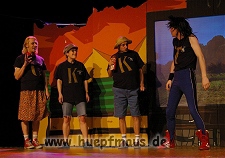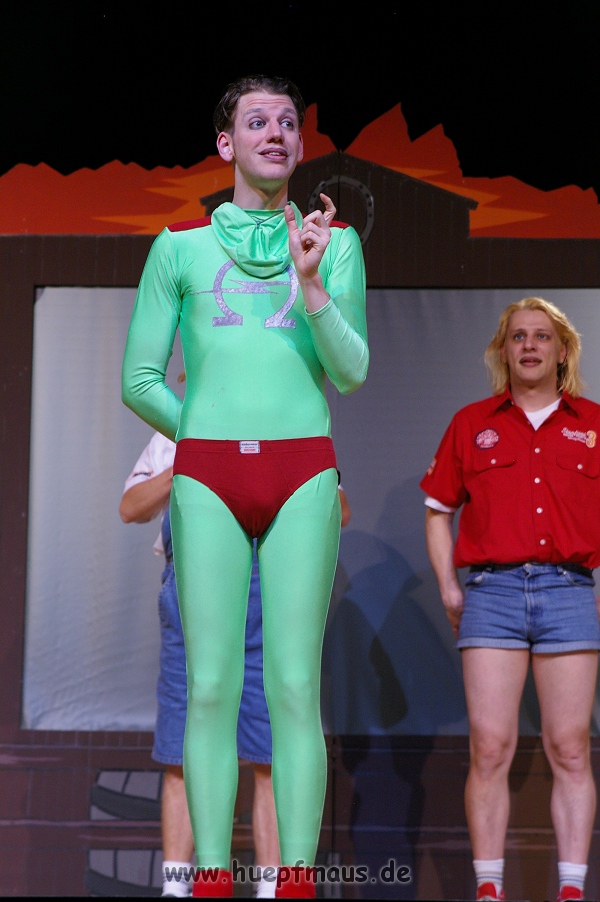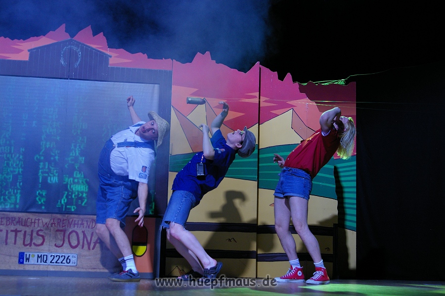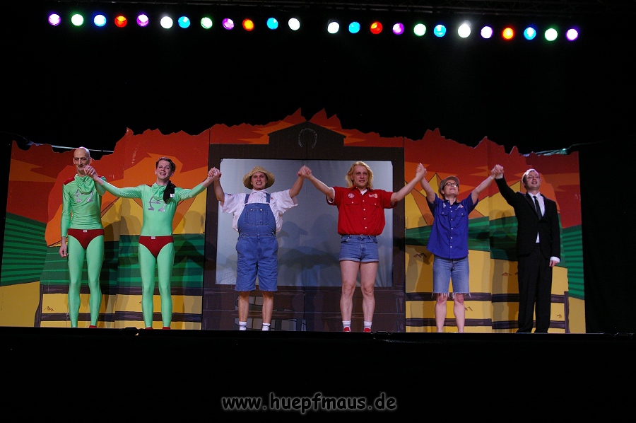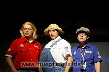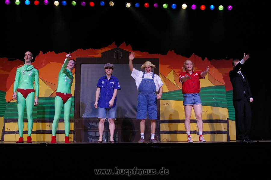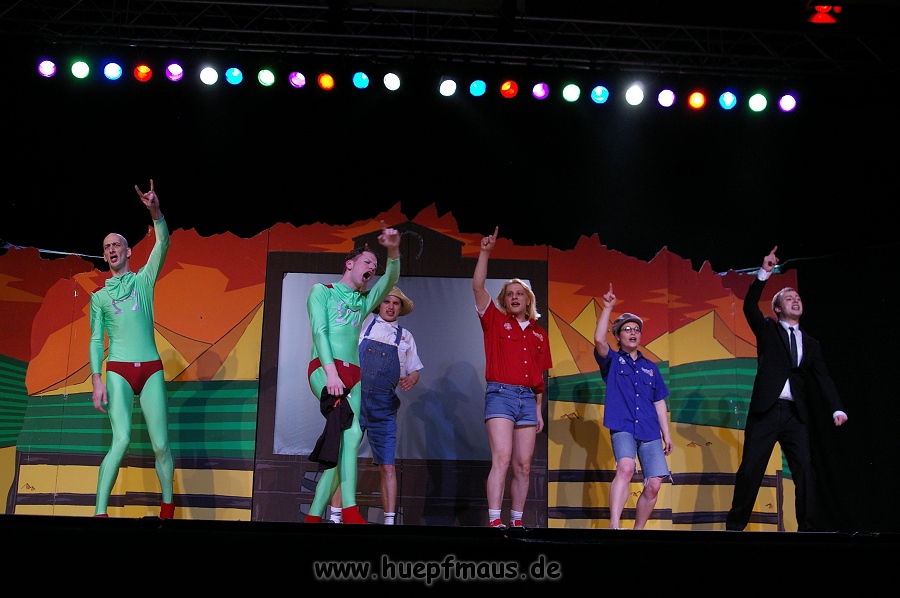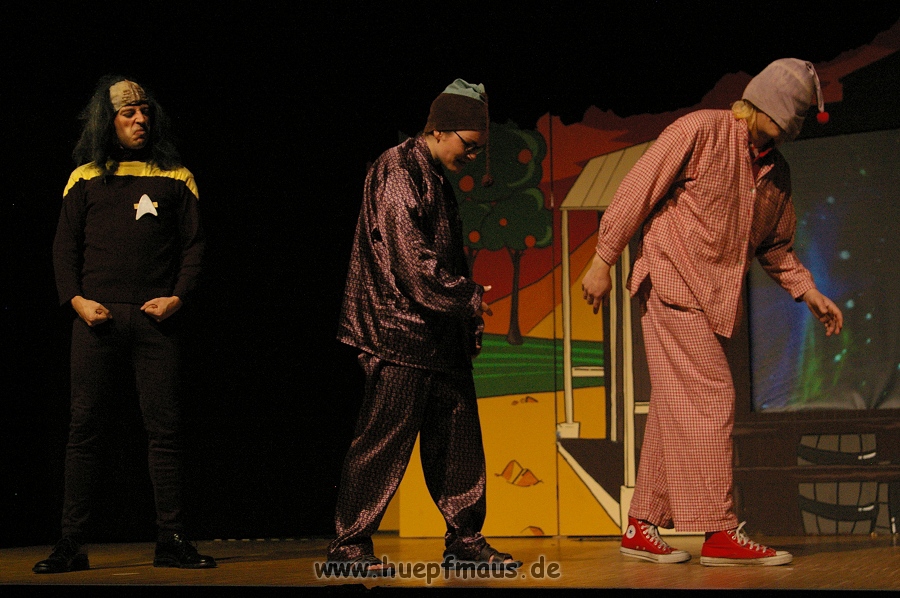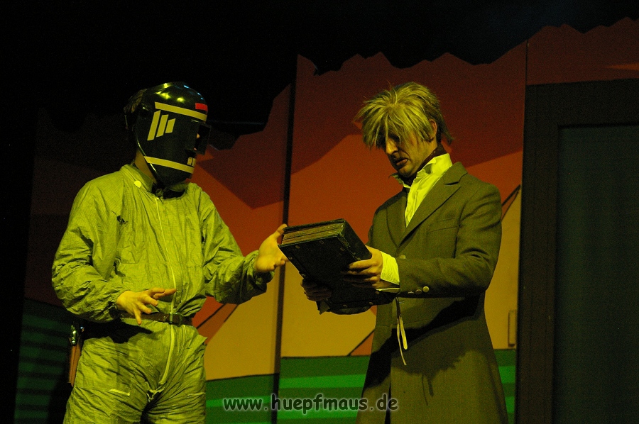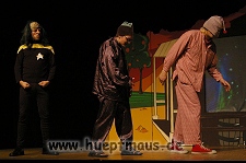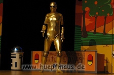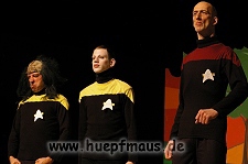 Und das zu recht, denn die Jungs und Mädels waren mal wieder absolut klasse. Auch wenn die Folge „Die Drei ??? und die bedrohte Ranch“ bei vielen Fans nicht ganz so beliebt ist, hat das VPT mal wieder ein Meisterwerk daraus gemacht. Manta –ein auf der Erde vergessener Außerirdischer vom Planeten Omega- spazierte als zweiter Justus immer wieder auf die Bühne, dabei wollte er doch am liebsten nur „nach Hause telefonieren“. R2D2 und C3PO hatten einen Gastauftritt und auch die Crew der Enterprise durfte natürlich nicht fehlen. Der Ideenreichtum des VPT scheint unerschöpflich, ihnen fällt zu jeder Situation wieder etwas neues ein. Dennoch werden alte Klassiker, die einfach zu jedem Stück gehören, nicht vergessen: TKKG, John Sinclair und natürlich die Matrix-Szene wurden vom Publikum begeistert gefeiert, ebenso „Paradise City“ von Guns´n´Roses, zu dem die Jungs im wahrsten Sinne des Wortes abrockten.